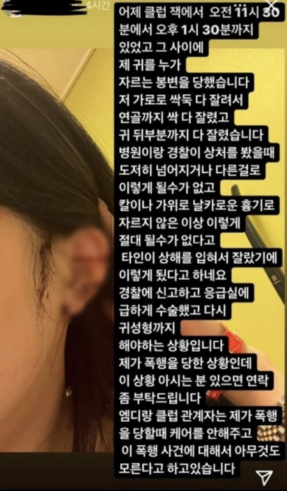 서울 강남 유명 클럽에서 한 여성의 귀가 잘리는 사건이 발생한 가운데 피해자 A씨가 직접 인스타그램에 글을 올렸습니다. 이와 관련한 내용 정리해보았습니다.