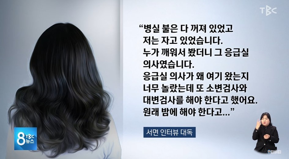 환자 B씨는 "누가 깨워서 봤더니 그 응급실 의사였다"며 "응급실 의사가 왜 여기 왔는지 너무 놀랐는데 또 검사를 해야 한다고 했다. 원래 밤에 해야 한다며.."라고 회상했습니다.
