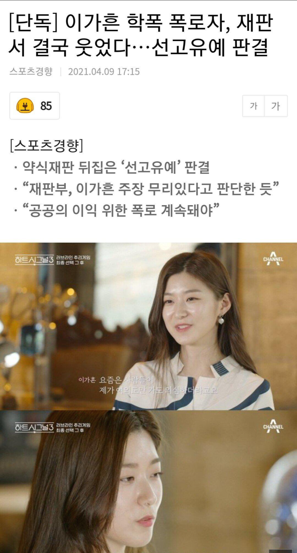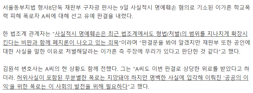이후 이가흔측은 사실 적시에 따른 명예훼손 혐의로 A씨를 재고소했고, 재판부는 선고 유예 판결을 내렸습니다.