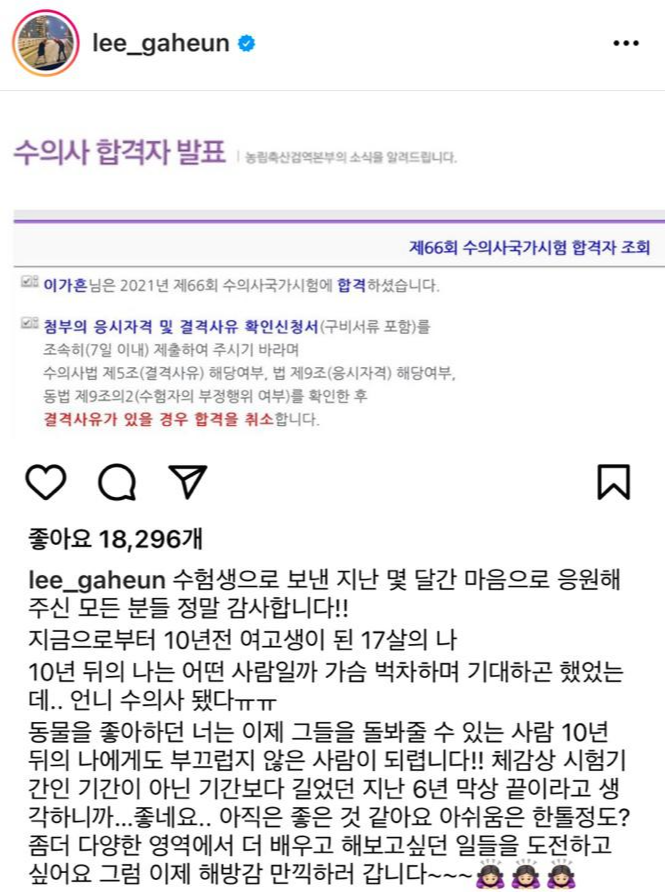 이가흔은 "수험생으로 보낸 지난 몇 달 간 마음으로 응원해준 모든 분들 정말 감사합니다"라며 "지금으로부터 10년 전 여고생이 된 열일곱 살의 나. 10년 뒤의 나는 어떤 사람일까 가슴 벅차하며 기대하곤 했었는데... 언니 수의사 됐다ㅠㅠ"라고 글을 게재했습니다.