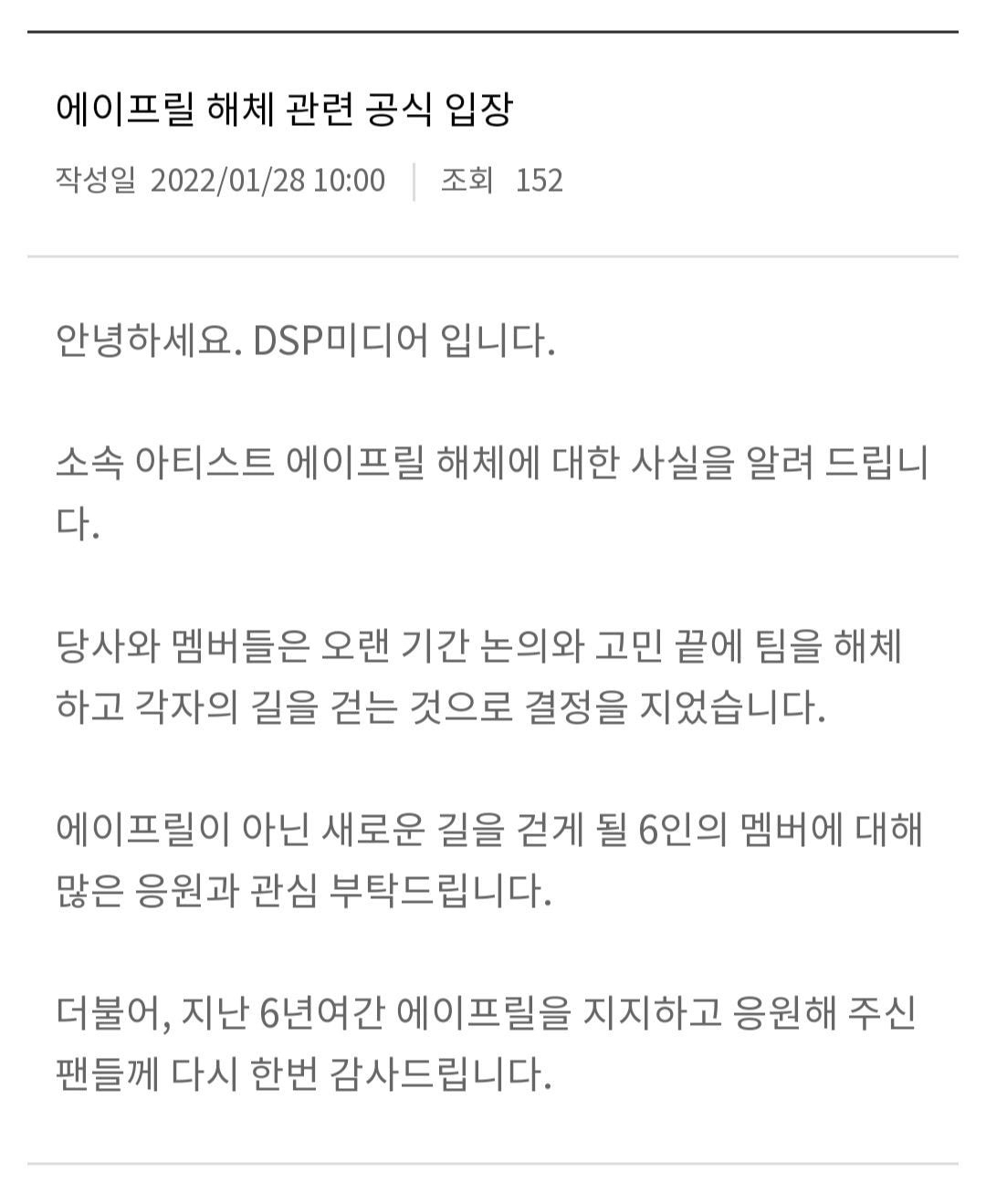 에이프릴의 소속사 DSP미디어는 28일 "당사와 멤버들은 오랜 기간 논의와 고민 끝에 팀을 해체하고 각자의 길을 걷는 것으로 결정을 지었다"면서 이렇게 밝혔습니다.