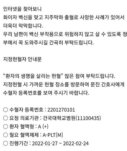 이태근의 지인이라고 밝힌 네티즌은 "(이태근이) 기저질환이 있었지만 쌍둥이 낳고 잘 살고 계셨다. 백신 3차 맞고 지금 중환자실에 있다고만 전해 들었는데 헌혈이 급하다고 해서 부탁 글 올린다"며 이태근의 아내 A씨의 글도 함께 공개되었습니다.