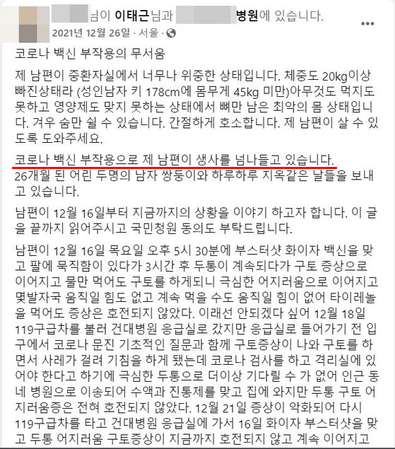 이태근의 아내 A씨는 "인터넷을 찾아보니 화이자 백신을 맞고 지주막하 출혈로 사망한 사례가 있어서 더욱더 막막하다"라며 "우리 남편이 백신 부작용을 위험하지 않고 살 수 있도록 꼭 도와주시길 바란다"고 호소했습니다.