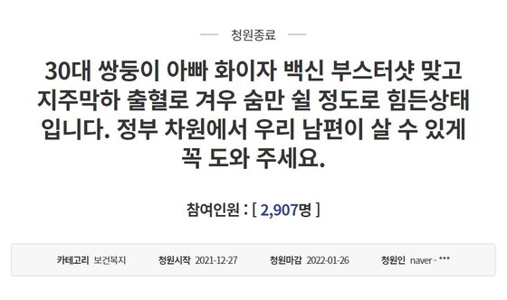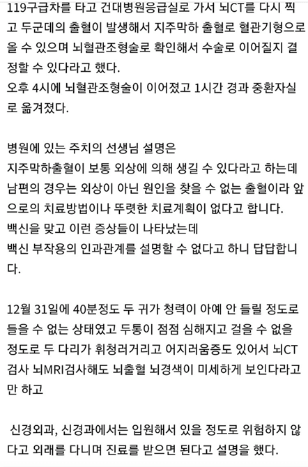 이태근의 아내 A씨는 "인터넷을 찾아보니 화이자 백신을 맞고 지주막하 출혈로 사망한 사례가 있어서 더욱더 막막하다"라며 "우리 남편이 백신 부작용을 위험하지 않고 살 수 있도록 꼭 도와주시길 바란다"고 호소했습니다.