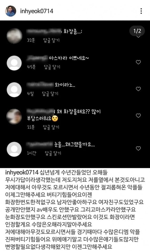 김인혁은 지난 18일 오후 인스타그램에 자신의 사진에 달린 화장과 관련된 악플 내용을 공개했습니다. 댓글에는 "왜 화장을 하냐. 부담스럽다", "눈을 왜 그렇게 (화장) 했냐" 등의 내용이 적혀있었습니다.