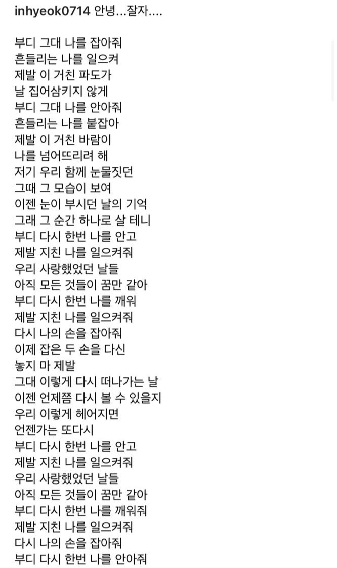 또한 숨지기 전날인 3일 김인혁은 인스타그램에 장문의 글을 올리기도 했는데요, "제발 이 거친 파도가 날 집어삼키지 않게 부디 그대 나를 안아줘" 등의 내용의 글을 올리기도 했습니다.