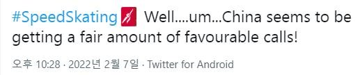 경기 이후 이같은 해시태그와 함께 국내외 네티즌들은 "이게 올림픽 정신이냐", "올림픽이 아니라 중국 체육대회다" 등의 의견을 올리고 있습니다. 해외 네티즌들도 "중국에 너무 유리한 판정을 하고 있다", "쇼트트랙의 판정이 끔찍했다" 등의 지적을 하고 있습니다.