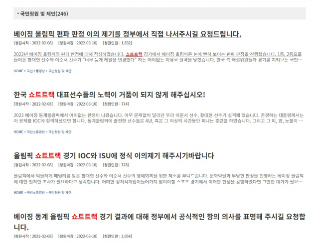 청와대 국민청원 게시판에는 '현재 2022 베이징 올림픽 쇼트트랙 실격 제대로 대응해주시길 부탁드립니다'라는 제목의 글도 올라왔습니다. 현재 청와대 국민청원 게시판에는 비슷한 청원이 줄줄이 이어지고 있습니다.