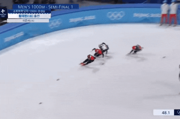7일 열린 1000m에서는 편파판정이 더 심해졌는데요, 한국 대표팀의 황대헌이 준결승 1조에서 중국 선수 두 명을 추월해 1위를 차지했는데, 별다른 접촉이 없었음에도 레인 변경을 늦게 했다는 이유로 페널티 판정을 받아 탈락했습니다.