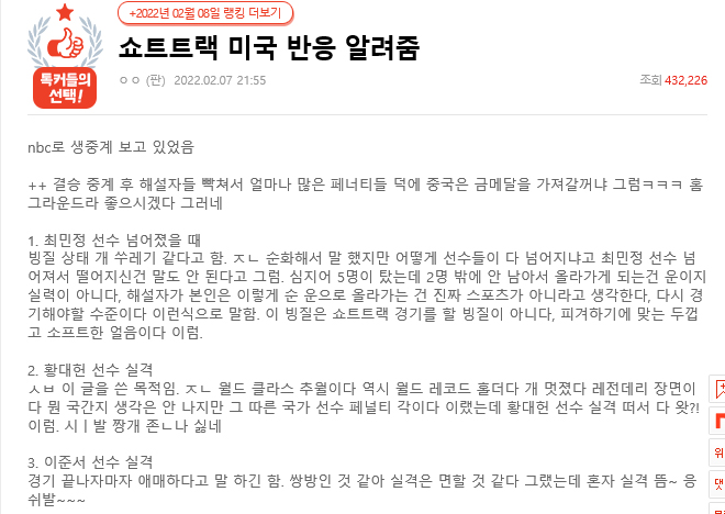 베이징 동계올림픽 쇼트트랙 편파판정 논란 국내외 반응 (+외신)