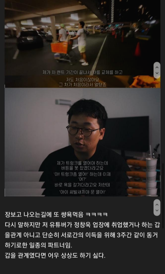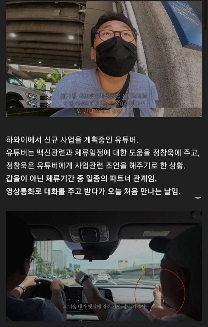 하지만 정창욱은 호드벤처를 만나자마자 반말을 사용하고 "내 허락받고 영상을 촬영하라"며 하대했습니다. 뿐만 아니라 호드벤처가 렌터카 이용에 다소 어색한 모습을 보이자 욕설을 사용하며 모욕했습니다.