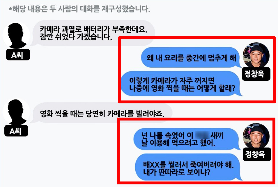 정창욱 셰프의 유튜브 채널에서 편집자로 일했던 팽이로 이 영상에 댓글을 달았습니다. 팽이는 "1년간의 짧은 기간 동안 함께 생활하면서 폭언과 욕설을 겪었다. 칼을 사용한 협박과 이런 모습을 편집하기 위해서 수십 번씩 영상을 돌려봤다"고 말했습니다.