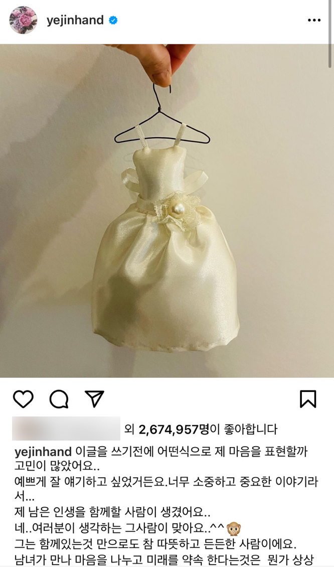 지난 10일 손예진과 현빈은 인스타그램을 통해 결혼 소식을 전했는데요, 손예진은 자신의 인스타그램을 통해 "제 남은 인생을 함께할 사람이 생겼다"며 "여러분이 생각하는 그 사람이 맞다"고 연인 현빈과의 결혼을 발표했습니다.