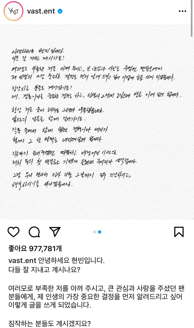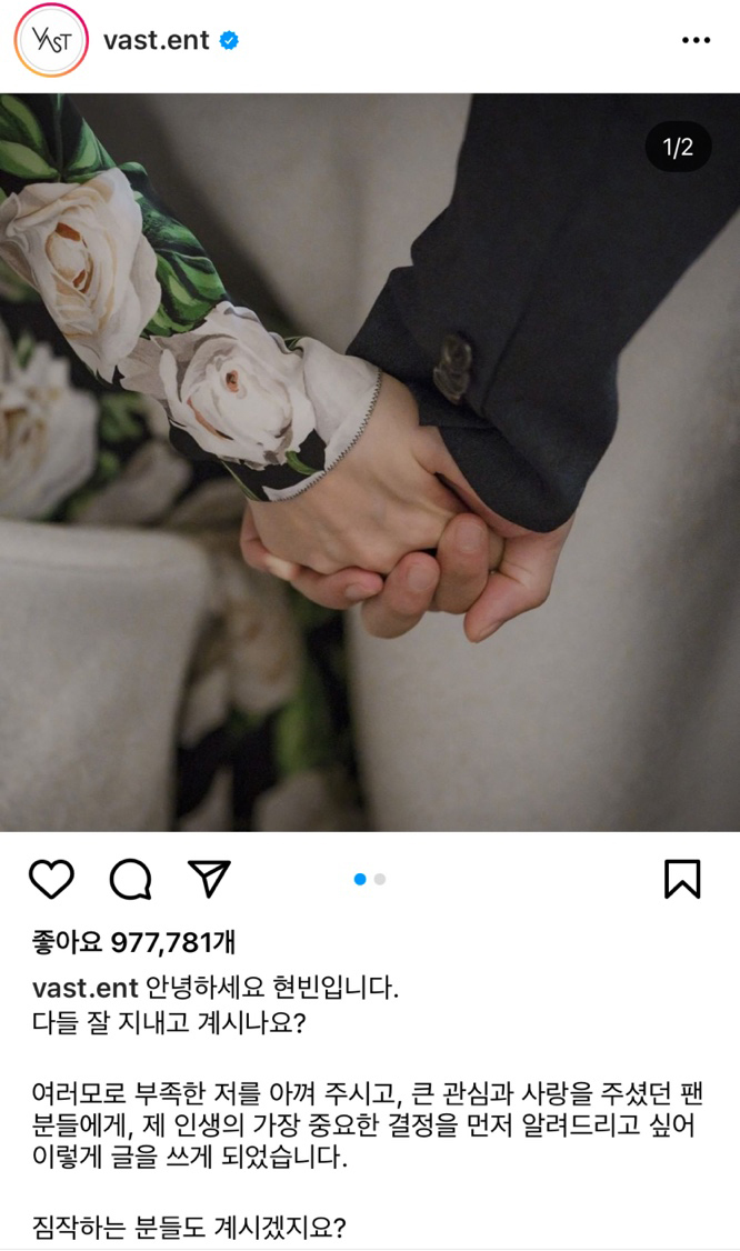 현빈 역시 소속사 인스타그램을 통해 "짐작하는 분들도 계실 것"이라고 시작하는 글과 함께 "결혼이라는 중요한 결정을 하고 인생의 2막에 조심스레 발을 디뎌 보려한다"며 결혼을 공식화했습니다.