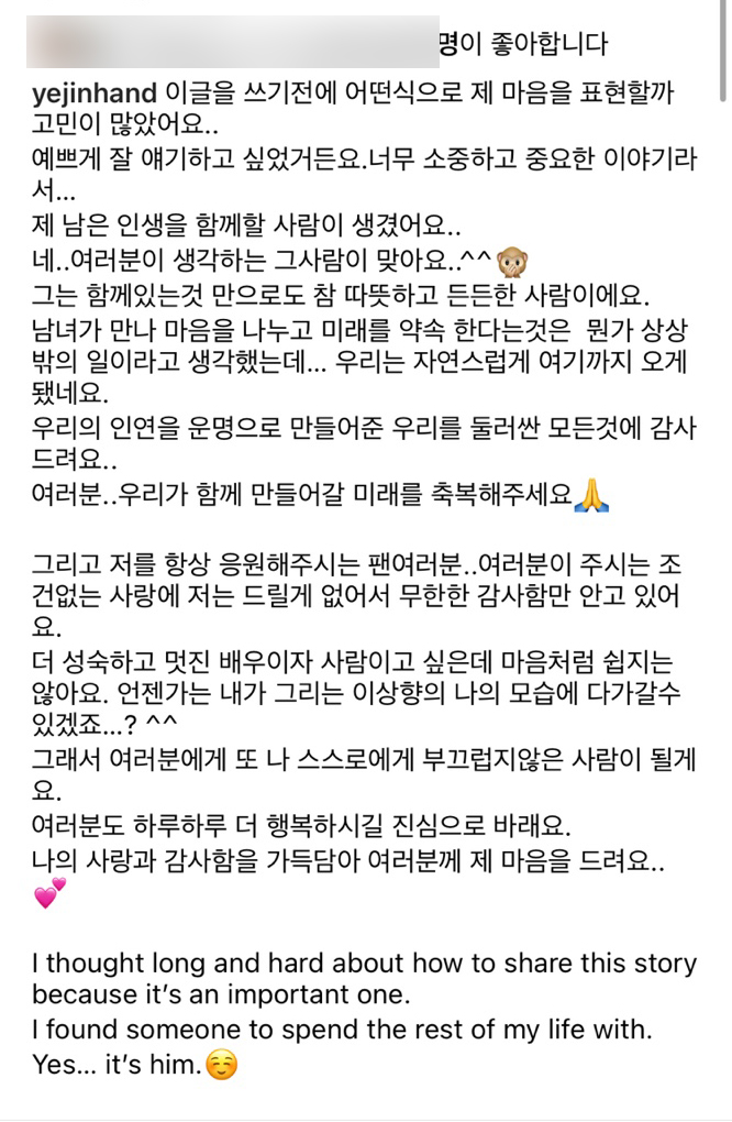 이어 "우리의 인연을 운명으로 만들어준 모든 것에 감사드린다. 미래를 축복 해달라"고 인사했습니다.