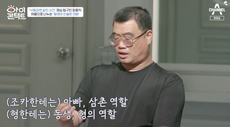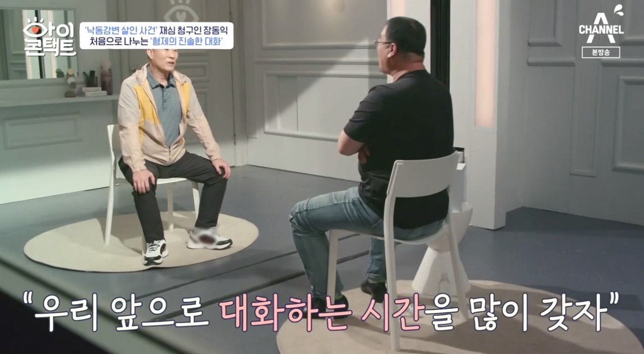 25일 방송된 채널A '아이콘택트'에서는 '낙동강변 살인사건' 범인으로 지목돼 21년간 옥살이를 한 장동익 씨가 막내동생과 눈 맞춤을 가졌습니다. 사건을 담당한 재심 전문 변호사 박준영이 이날 스페셜 MC로 참여했습니다.