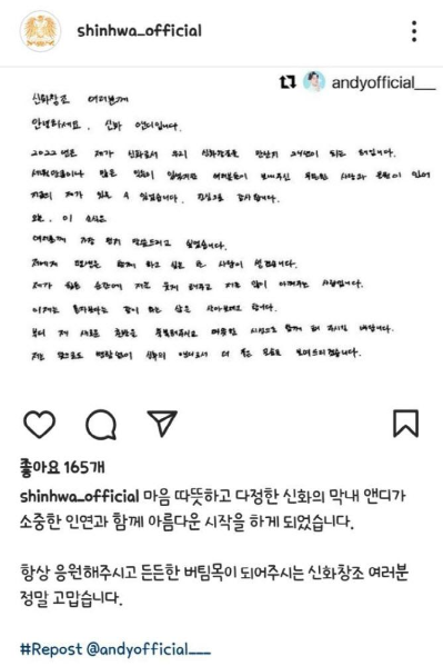 이어 "새로운 출발을 축복해 주시고 따뜻한 시건으로 함께해 주시길 바란다. 앞으로도 신화의 앤디로서 더 좋은 모습을 보여드리겠다"고 덧붙였습니다.