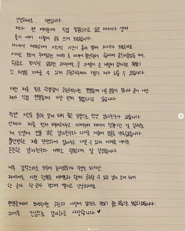 지연은 "작년 지인을 통해 알게 되어 좋은 감정으로 만난 남자친구가 있다"며 "제 인생에 선물 같은 남자친구와 다가올 겨울에 결혼을 약속했다"고 밝혔습니다.
