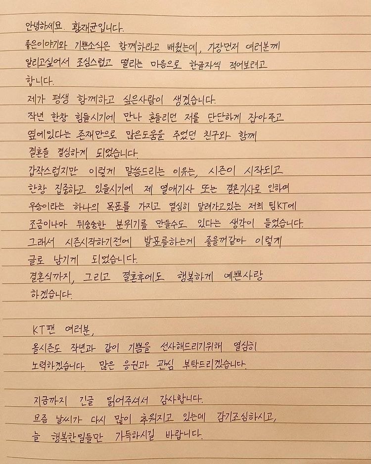 황재균과 지연은 10일 오후 각각 인스타그램을 통해 커플 사진과 함께 자필편지를 게시하며 결혼 소식을 전했는데요, 두 사람은 다정한 커플 사진도 함께 공개하며 깜짝 결혼 발표로 팬들을 놀라게 했습니다.