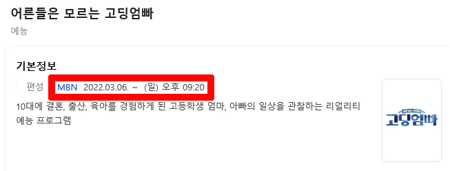 한편 고딩엄빠는 10대에 결혼, 출산, 육아를 경험하게 된 고등학생 엄마, 아빠의 일상을 관찰하는 리얼리티 예능으로, 오는 오는 3월 6일 밤 9시 20분 첫 방송될 예정입니다.