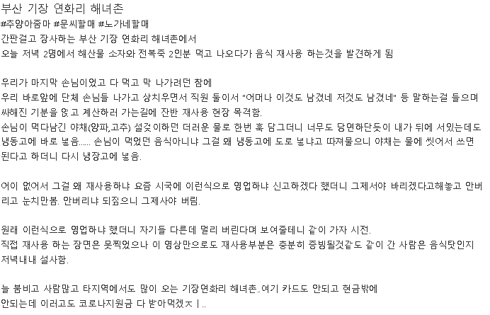 20일 온라인 커뮤니티 보배드림에는 '부산 기장 연화리 횟촌(해녀촌) 잔반 재사용 실태'라는 제목의 글과 함께 영상이 올라왔습니다.