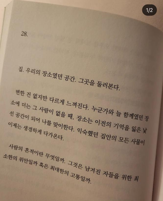 이혜성이 올린 사진 속 책 글귀에는 "누군가와 늘 함께였던 장소에 더는 그 사람이 없을 때 장소는 이전의 기억을 잃은 낯선 공간이 되어 나를 반긴다" "익숙했던 집안의 모든 사물이 생경하게 다가온다" "사람의 흔적이란 무엇일까" 등의 내용이 이어졌습니다.