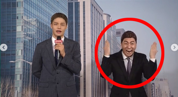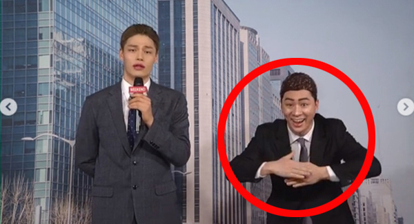 모델 정혁이 기자 역할을, 그 옆에 선 배우 정상훈은 인공지능 로봇(AI) '기가 후니' 역할을 맡아 정혁의 멘트를 전하는 수어 통역사 연기를 했습니다.