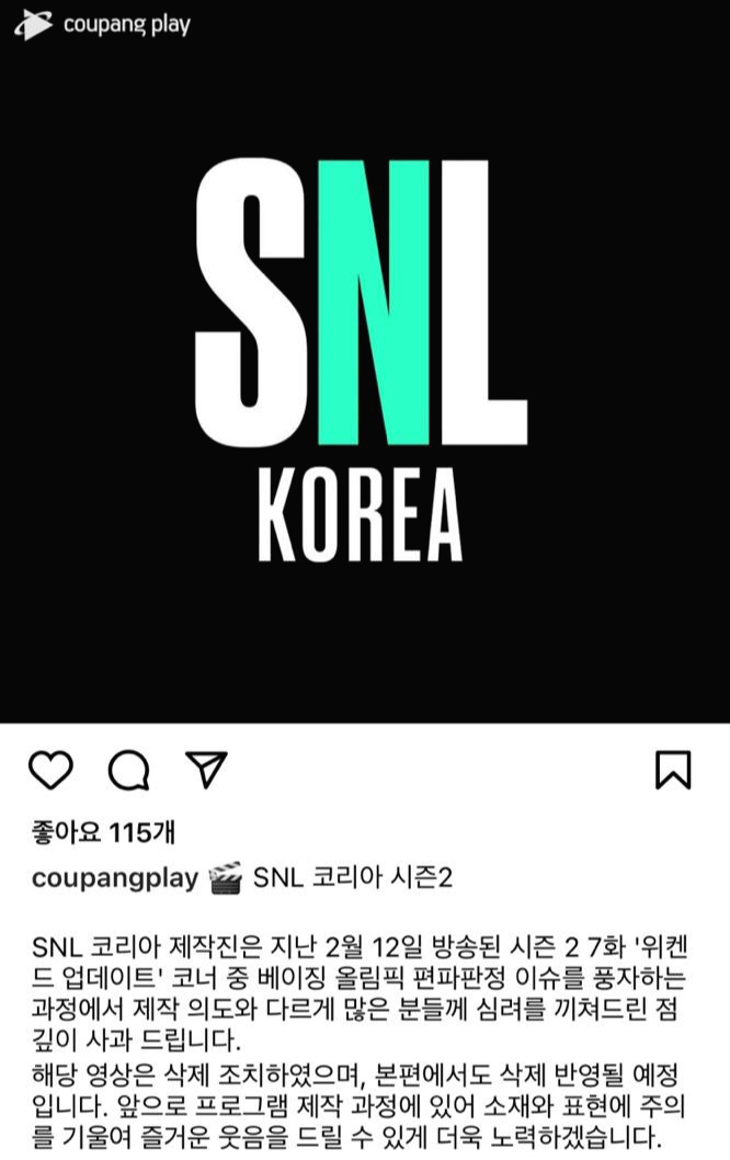 논란이 확산되자 쿠팡플레이측은 공식 인스타그램을 통해 "'SNL 코리아' 제작진은 지난 12일 방송된 시즌2 7화 '위켄트 업데이트' 코러 중 베이징 올림픽 편파 판정 이슈를 풍자하는 과정에서 제작 의도와는 다르게 많은 분들께 심려를 끼쳐 드린 점 깊이 사과 드린다"고 밝혔습니다.