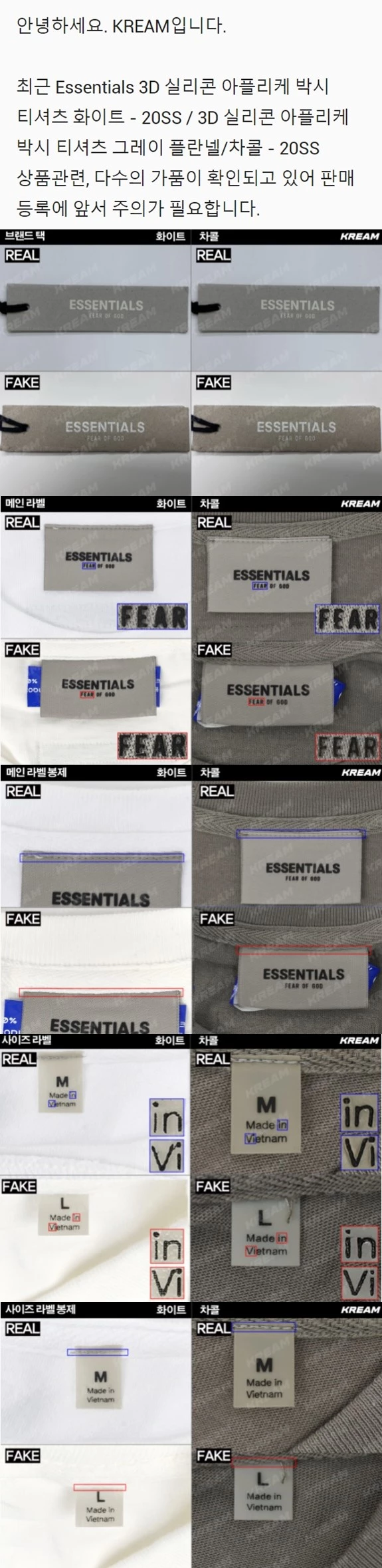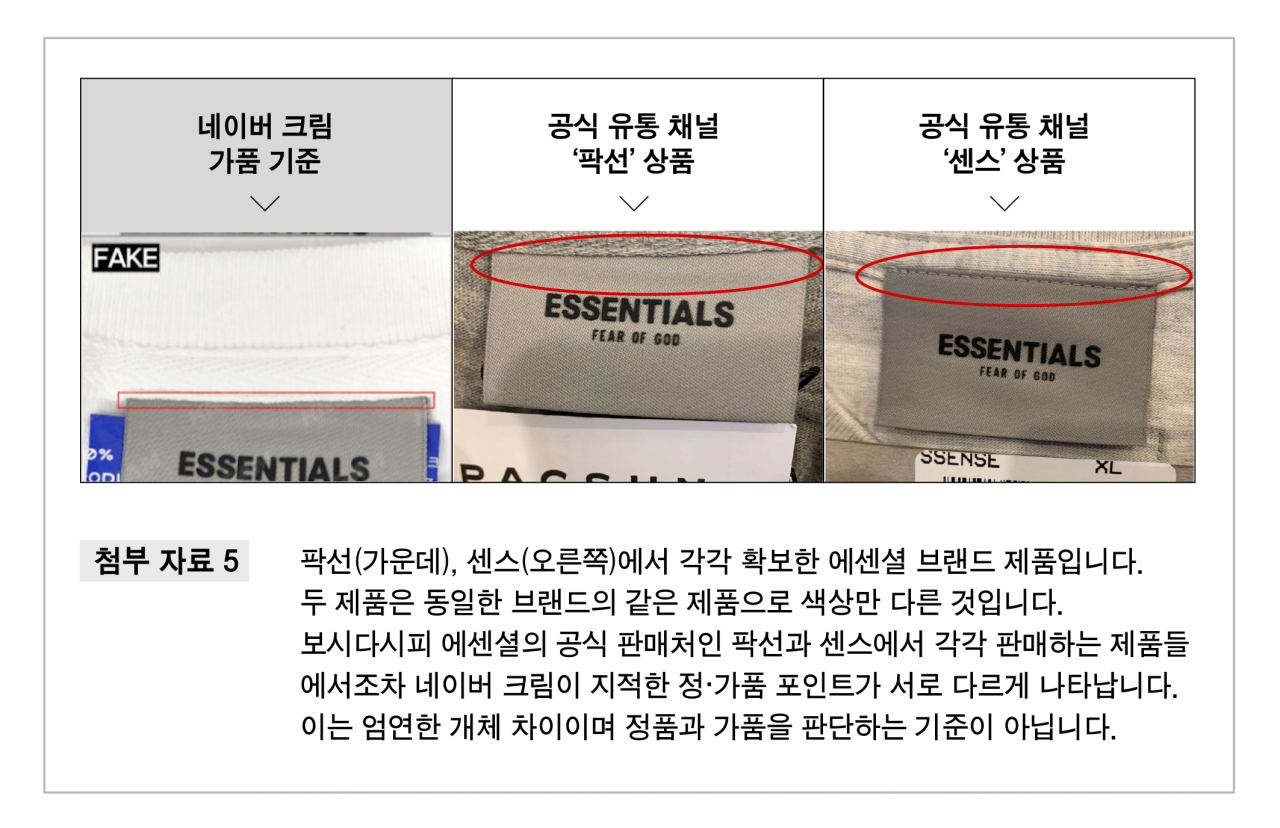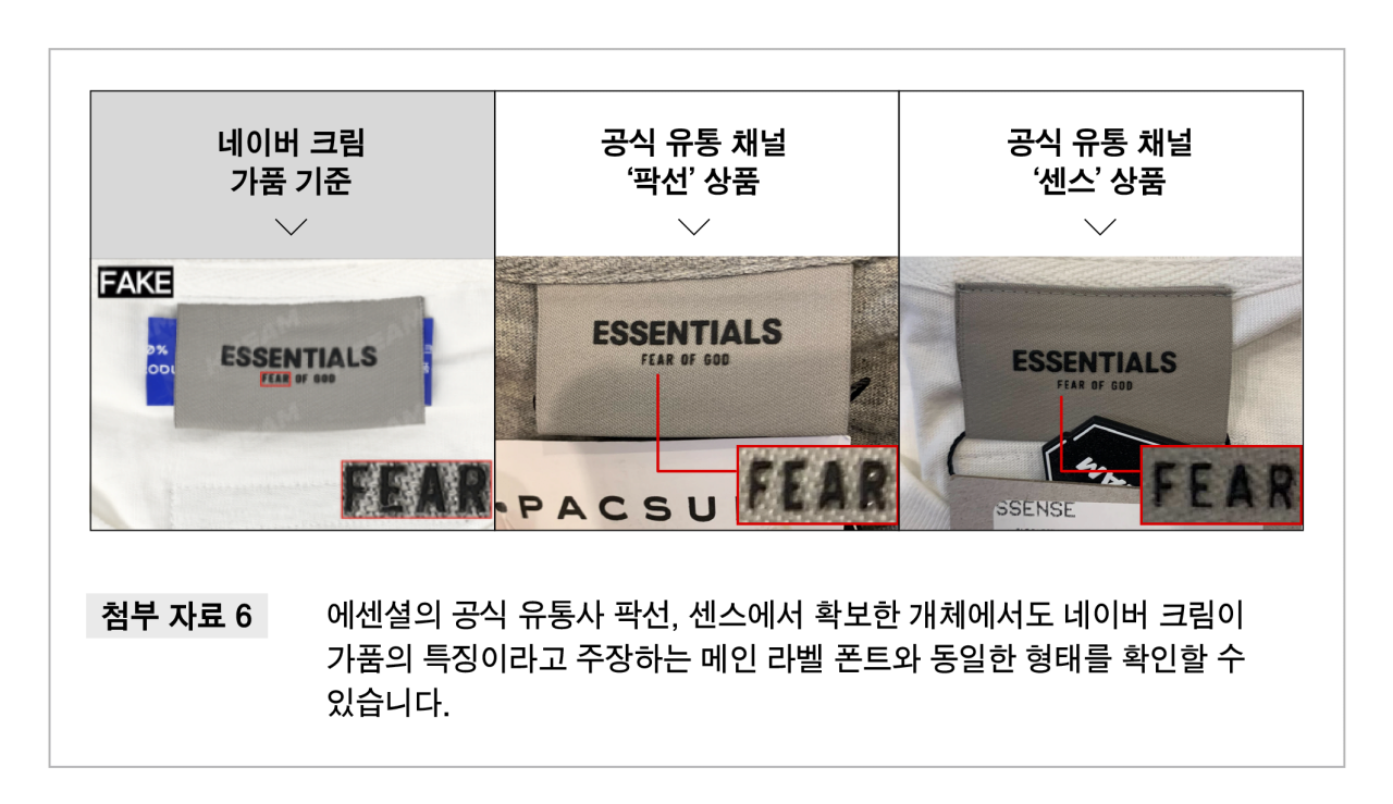 무신사 측은 '넥 라인의 메인 라벨 봉제 방식' 주요한 정·가품 기준이 된다는 크림의 주장에도 반박했습니다. 에센셜 공식 유통사 팍선과 센스에서 판매 중인 제품을 직접 살펴본 결과, 각각의 개체에서 네이버 크림이 주장하는 정품과 가품의 포인트가 모두 확인되었다고 설명했습니다.