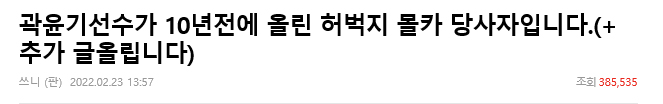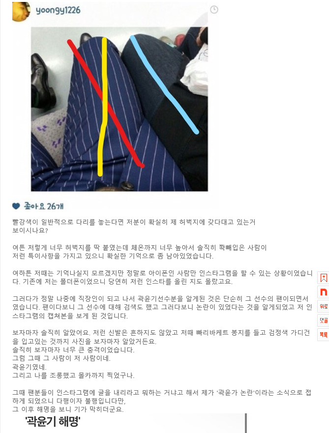 글쓴이는 "사건을 알게 된 이후부터 지금까지 잊은 적이 없다. 곽 선수가 허벅지를 쭉 벌려서 옆에 앉은 사람과 허벅지를 비교하며 선수인 자신보다 허벅지가 튼실하다고 비꼰 사람이 바로 나다"라고 했습니다.