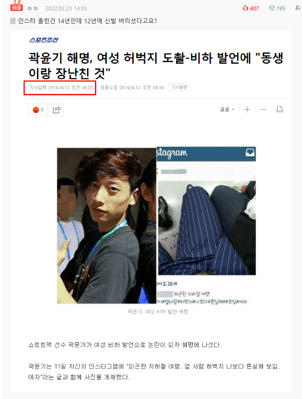 23일 한 온라인커뮤니티에는 "곽윤기 선수가 10년 전에 올린 허벅지 몰카 당사자입니다"라는 제목의 글이 올라오며 곽윤기의 지하철 몰카 논란이 제기되었습니다.