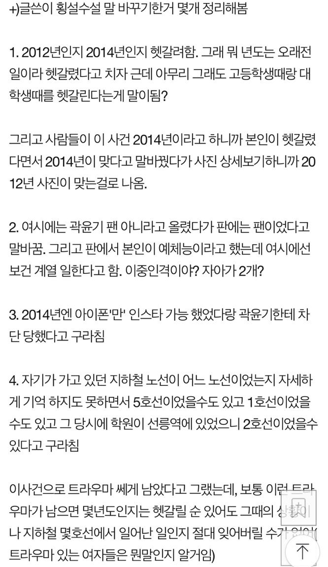 하지만 해당 주장글이 조작이라는 증거가 여러 차례 포착돼 여론이 바뀌었는데요, 일단 글쓴이는 해당 사건이 2012년에 있었다고 했으나 곽윤기의 인스타그램 글은 2014년에 게재되었습니다.