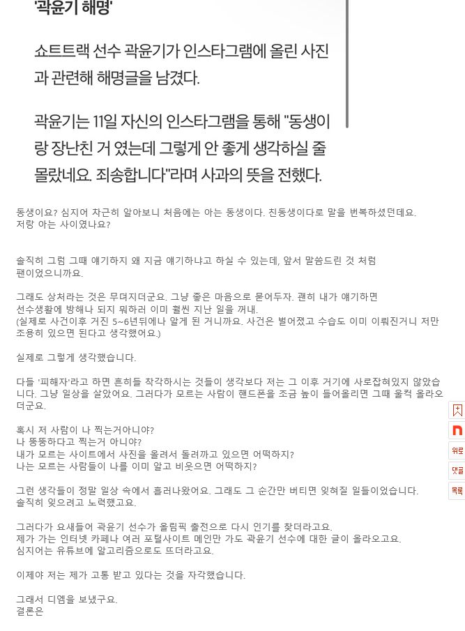 이후 곽윤기는 해당 여성은 자신의 여동생이라고 해명했는데요, 하지만 글을 게재한 여성은 곽윤기의 여동생이 아닌 자신이며 곽윤기의 해명이 거짓이라고 주장했습니다.