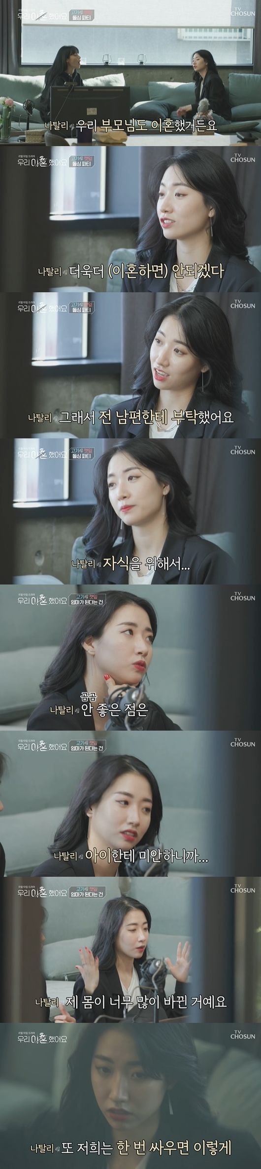 이어 배수진(나탈리)는 "우리 부모님도 이혼했는데, 그래서 더 욱더 이혼하면 안 되겠다고 생각했다. 그래서 오빠한테 이혼해도 같이 친하게 지내고 싶다고 부탁했다. 마음이 있는 건 아니지만 자식을 위해서 그랬다"고 말했습니다.