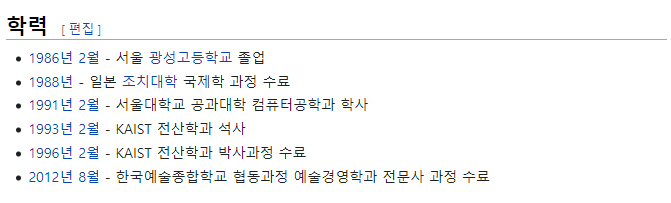 학력: 광성고등학교- 조치대학- 서울대학교- 한국과학기술원(박사과정 중퇴)- 한국예술종합학교