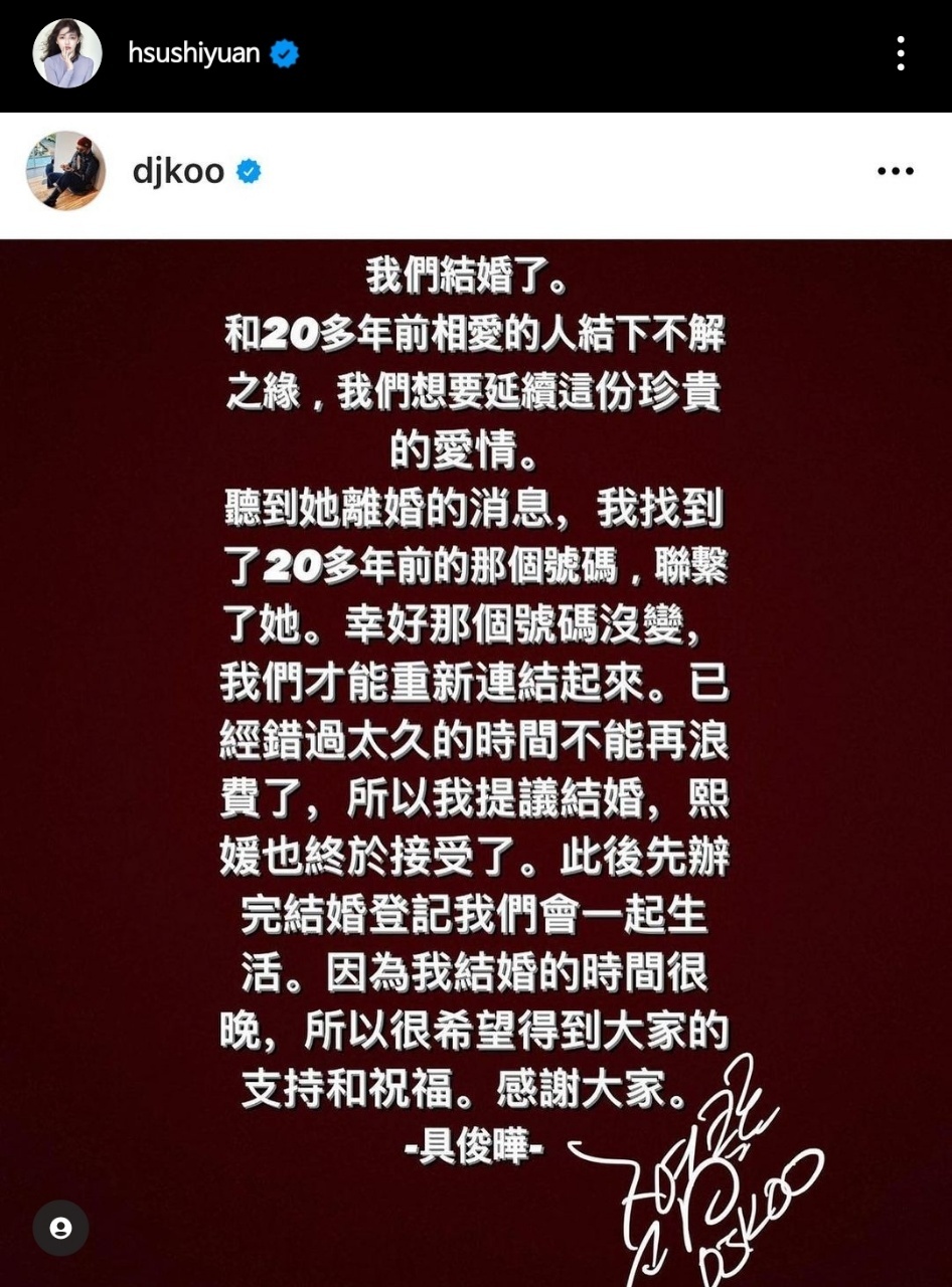 구준엽은 8일 인스타그램에 "저 결혼한다. 20년 전 사랑했던 연인과 매듭 못 지은 사랑을 이어가려한다"며 "그녀의 이혼 소식을 듣고 20년 전 그 번호를 찾아 연락을 해봤다. 다행히 그 번호 그대로여서 우린 다시 연결될 수 있었다"고 말했습니다.