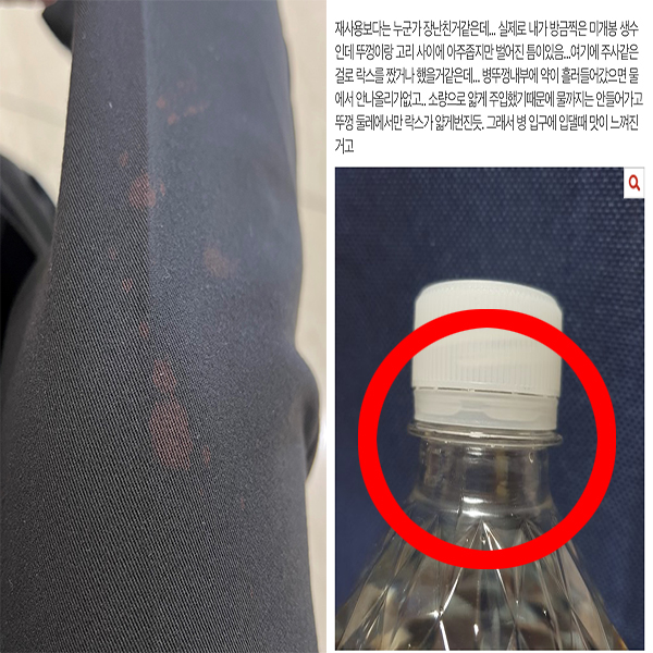 A씨는 "입술은 따갑고 락스 특유의 독한 냄새는 계속 입안을 맴돌았다"며 "생수에서도 여전히 락스 냄새가 진동했고, 물방울이 튄 바지는 그 자국을 따라 탈색됐다"고 주장했습니다.