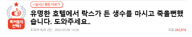 지난 9일 한 온라인 커뮤니티에는 '유명 호텔에서 락스가 든 생수를 마시고 죽을 뻔했습니다'라는 제목의 글이 올라왔습니다.