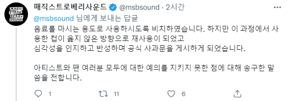 밴드 십센치 소속사 매직스트로베리사운드는 10일 공식 트위터를 통해 "10cm 생일 이벤트를 위해 팬 여러분께서 준비해주신 일회용 컵을 옳지 않은 방향으로 재사용했다"며 사과했습니다.