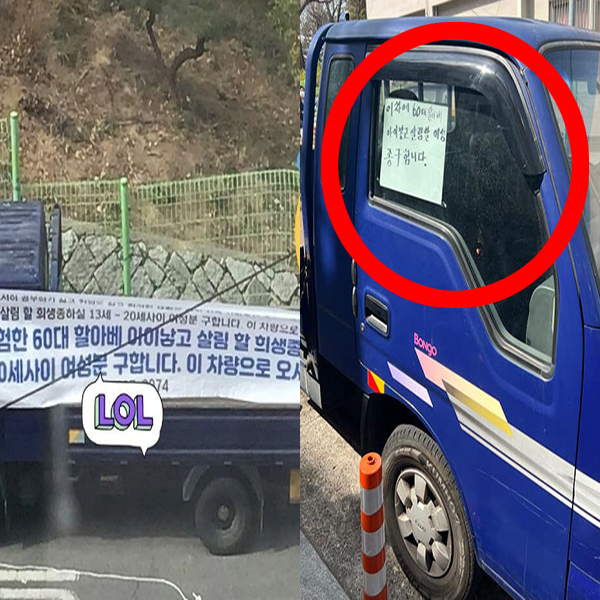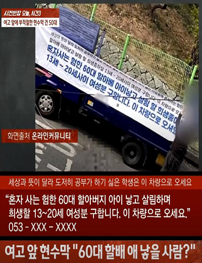 문제가 된 현수막에는 "세상과 뜻이 달라 도저히 공부가 하기 싫은 학생은 이 차량으로 와라"며 "혼자 사는 험한 60대 할아버지의 아이를 낳고 살림할 희생종 하실 13~20세 사이 여성 분 구한다"는 내용의 글귀가 담겼습니다. 하단에는 연락처로 추정되는 번호도 함께 쓰여 있었습니다.