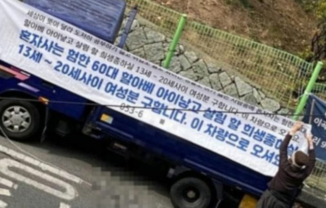 문제가 된 현수막에는 "세상과 뜻이 달라 도저히 공부가 하기 싫은 학생은 이 차량으로 와라"며 "혼자 사는 험한 60대 할아버지의 아이를 낳고 살림할 희생종 하실 13~20세 사이 여성 분 구한다"는 내용의 글귀가 담겼습니다. 하단에는 연락처로 추정되는 번호도 함께 쓰여 있었습니다.