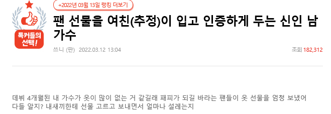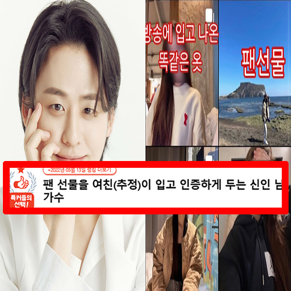 최근 각종 온라인 커뮤니티에서는 '팬 선물을 여친(추정) 입고 인증하게 두는 신인 남가수'라는 제목의 글이 게재되었습니다.