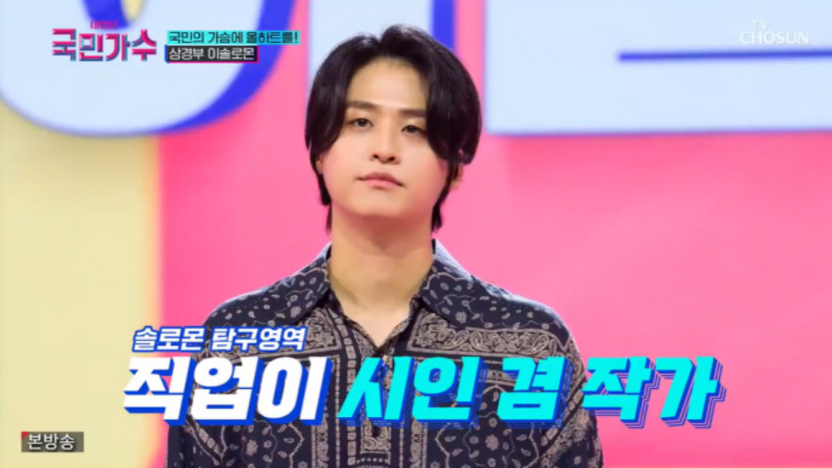 이솔로몬은 시인 출신 신인 가수로 최근 TV조선 오디션 프로그램 '내일은 국민가수'로 큰 사랑을 받았습니다. 그는 훈훈한 외모와 노래실력으로 주목받으며 최종 3위를 기록했습니다.