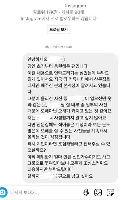 작성자는 "데뷔 4개월 된 내 가수가 옷이 많이 없는 거 같길래 패피가 되길 바라는 팬들이 옷 선물을 엄청 보냈다"며 "그러다 선물 보낸 팬들이 내 가수 여자친구로 추정되는 인스에서 대뜸 인증을 받게 됐다"라고 밝혔습니다.