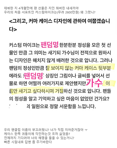 또 팬들이 선물한 고가의 커스텀 마이크에 팬클럽명이나 상징 그림을 넣기 희망했지만 이솔로몬이 거절했다는 의혹이 제기되며 팬 기만 논란이 불거졌습니다.