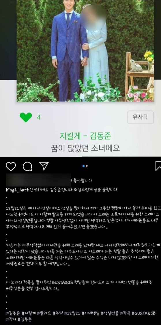 와이프 사랑꾼으로 알려진 김동준은 과거 와이프를 위해 자작곡을 만들어 많은 관심을 받았습니다. 노래 제목은 '지킬게'로 당시 음원 수익을 전액 기부해 화제가 되었습니다.