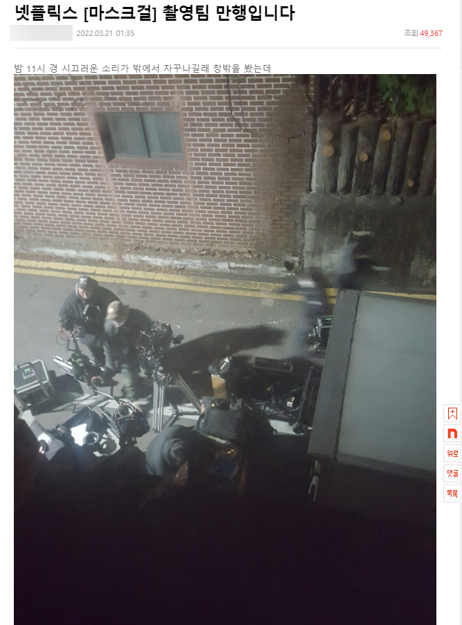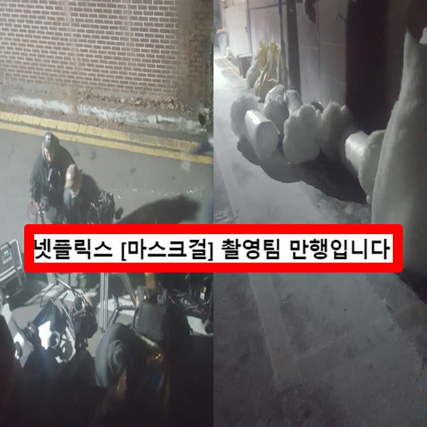 작성자는 "밤 11시경 시끄러운 소리가 밖에서 자꾸 나길래 창밖을 봤는데 촬영팀으로 보이는 사람들이 집앞 골목에서 촬영장비를 내리고 있었다, 시간이 지나면 가겠지 싶어서 기다렸는데 30분이 넘도록 시끄러운 소리가 나더라"며 결국 집 밖으로 나가 해당 촬영팀이 넷플릭스 '마스크걸'의 촬영팀인 것을 확인했다고 알렸습니다.
