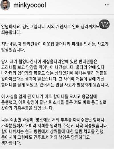 배우 김민교가 키우던 반려견이 이웃집 80대 할머니를 물어 숨지게 한 사고와 관련해 김민교가 금고형의 집행유예를 선고받은 사실이 뒤늦게 알려졌습니다.
