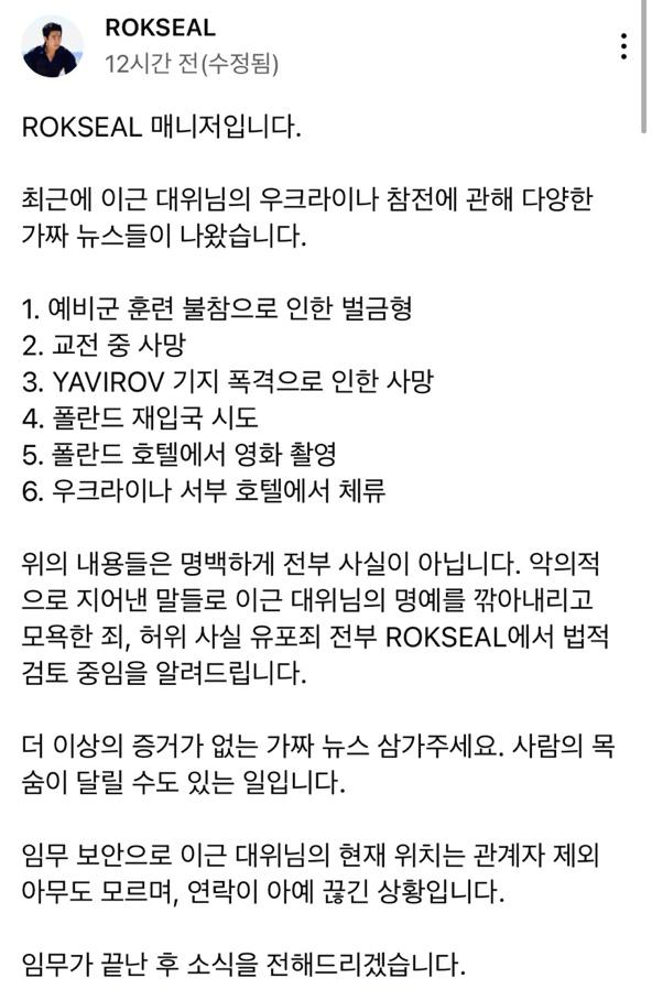 그는 "최근 이근 대위님의 우크라이나 참전에 관해 다양한 가짜 뉴스들이 나왔다"며 "내용들은 명백하게 전부 사실이 아니다"라며 "악의적으로 지어낸 말들로 이근 대위님의 명예를 깎아내리고 모욕한 죄, 허위 사실 유포죄 전부 록실에서 법적 검토 중임을 알려드린다"고 전했습니다.