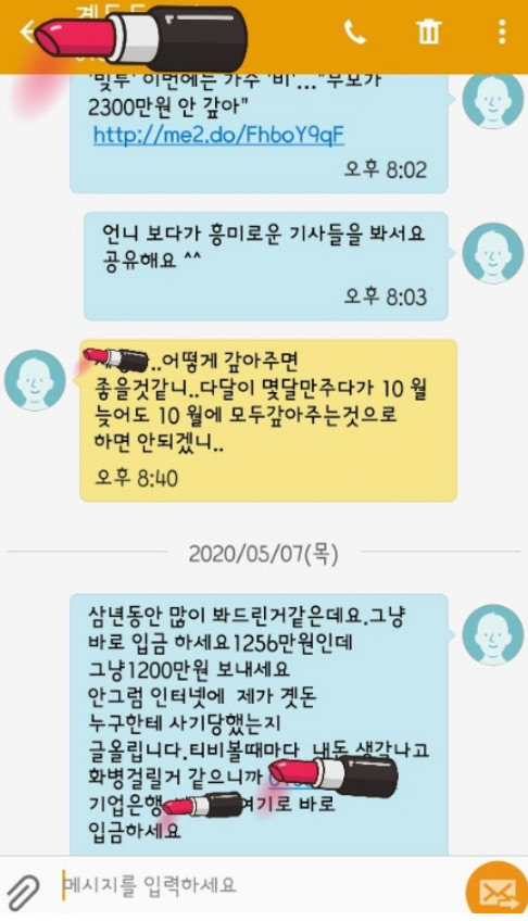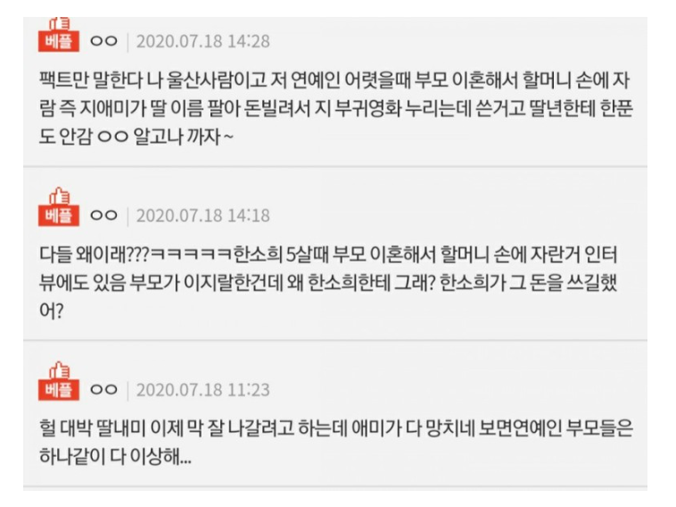 이어 "하지만 전화번호까지 바꾸면서 저에게 연락이 없더라"며 "그동안 원금만 받겠다 했는데도 안 주고.. 딸이 잘 나가면 한방이니 주겠다는 등 그때도 서울로 딸 엔터테인먼트에 찾아가고 그랬다"라고 적었습니다. 또한 "솔직히 그 연예인 TV에서 볼 때마다 너무 화가 나고 내 돈으로 저렇게 뜬 건가? 이런 생각밖에 안 든다 저 정말 그 돈 받고 꿈이 있었는데.. 다 망가졌다. 이젠 그냥 돈이고 뭐고 그 사람 벌줬으면 좋겠다"라고 처벌을 희망했습니다.